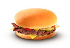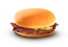Румяная булочка в сочетании с сыром "Чеддер", говядиной с вертела и маринованными огурчиком, заправленная кетчупом и горчицей.