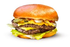 Большой Бургер с двумя сочными котлетами из отборной говядины, двойной порцией сыра и особого соуса в сочетании с маринованным огурчиком и свежим томатом на ароматной картофельной булочке.