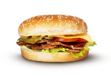 Румяная булочка с кунжутной посыпкой, начиненная говядиной с вертела, свежим томатом, салатом "Айсберг", маринованными огурчиками и сыром Чеддер, заправленная чесночным соусом.