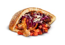 Нарезанное тонкими пластами сочное мясо курицы-гриль в сочетании со свежими овощами, сыром "Пармезан" и специальным соусом в свежевыпеченной румяной турецкой лепешке с кунжутом.