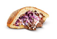 Румяная булочка в сочетании с маринованными огурчиком, говядиной с вертела, заправленная кетчупом и горчицей.